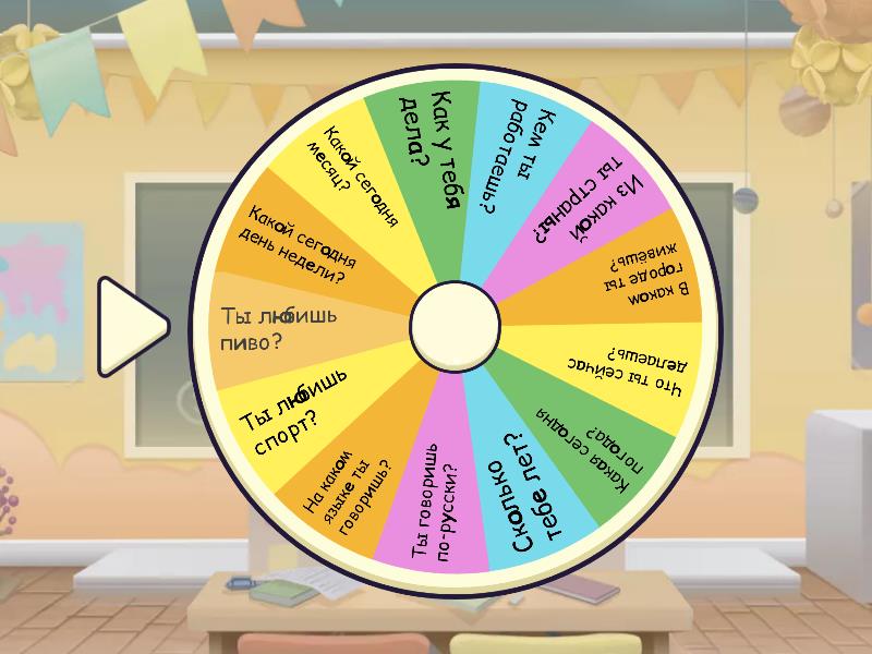 1) Какой сегодня день недели? 2) Какой сегодня месяц? 3) Как у тебя дела? 4) Кем ты работаешь? 5) Из какой ты страны? 6) В каком городе ты живёшь? 7) Что ты сейчас делаешь? 8) Какая сегодня погода? 9) Сколько тебе лет? 10) Ты говоришь по-русски? 11) На каком языке ты говоришь? 12) Ты любишь спорт? 13) Ты любишь пиво?