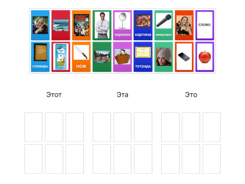 Этот: , , микрофон, нож, словарь, , Эта: , , тетрадь, , , картина, Это: , , , , , зеркало,