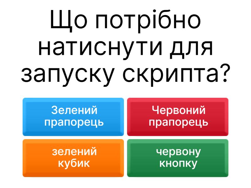 1) Що потрібно натиснути для запуску скрипта? a) Зелений прапорець b) Червоний прапорець c) зелений кубик d) червону кнопку 2) Що таке спрайт? a) Блок команд b) Костюм персонажа c) Скрипт d) Об'єкт, який виконує певні дії 3) Алгоритм - це ... a) Скінчена послідовність дій, спрямованих на розв'язування задачі b) Скінченна важка послідовність посилань на виконання дій, результат яких невідомий c) Нескінченна послідовність указівок на виконання дій, спрямованих на розв'язання задачі 4) Окрема вказівка для виконавця - це ... a) Програма b) Команда c) Наказ d) Алгоритм 5) На скільки кроків переміститься об'єкт в результаті виконання даної програми? a) 15 b) 5 c) 10 d) 25 6) Скільки разів виконавець скаже Hello? a) 2 b) 10 c) не говоритиме d) 5 7) Алгоритмічна структура, яка використовується для подання послідовного набору команд, що виконуються одна за одною - ... a) розгалуження b) слідування c) повторення d) сканування 8) Алгоритмічна структура, яка використовується для подання багаторазового виконання набору команд - ... a) розгалуження b) слідування c) повторення d) сканування 9) Алгоритмічна структура, що дає змогу виконавцеві алгоритму вибрати сценарій подальших дій залежно від істинності певної умови - ... a) сканування b) повторення c) слідування d) розгалуження 10) Файл, створений у середовищі Scratch, називають ... a) контейнером b) програмою c) проектом d) алгоритмом 11) Скільки разів буде виконуватися команда розміщена у тілі такого циклу? a) 10 разів b) один раз c) 15 разів d) завжди 12) Скільки команд розміщено в тілі даного циклу? a) 2 b) 4 c) 3 d) 5