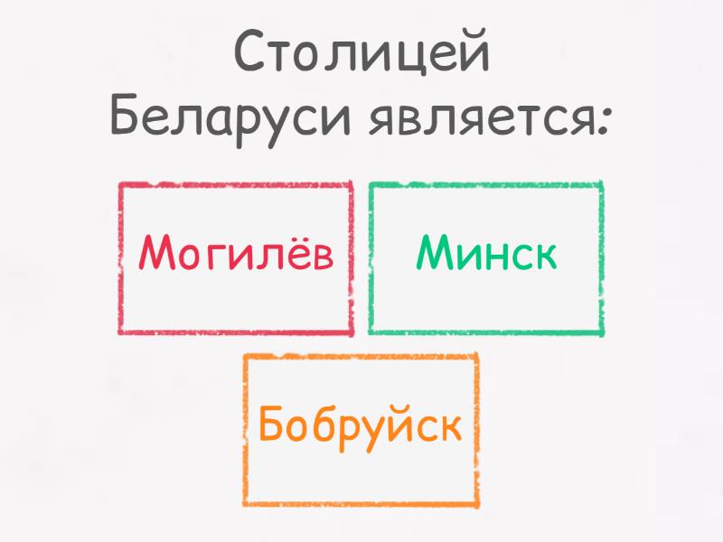 1) Столицей Беларуси является: a) Могилёв b) Минск c) Бобруйск 2) Как называется свод основных законов государства a) Конвенция b) Устав c) Конституция 3) В каком году была принята действующая конституция Беларуси: a) 1992 b) 1994 c) 1995 4) Назовите крупнейшее озеро Беларуси: a) Нарочь b) Белое озеро c) Освейское 5) Территория Беларуси составляет: a) 407 600 км² b) 272 500 км² c) 207 600 км² 6) Самая длинная река в Беларуси: a) Березина b) Днепр c) Припять 7) Какой климат в Республике Беларусь: a) Субтропический климат b) Умеренный резко континентальный климат c) Умеренно-континентальный климат 8) Назовите наивысшую точку Беларуси: a) Дзержинская b) Минская c) Держинская 9) В результате какой операции Второй Мировой войны была освобождена территория Беларуси a) «Молот» b) «Цитадель» c) «Багратион» 10) Что (из предложенных вариантов) изображено на гербе Беларуси: a) Солнце b) Рыцарь c) Крест 11) Как называется крепость, которая самой первой приняла удар фашистских захватчиков в начале войны? a) Бобруйская b) Мирский замок c) Брестская 12) Когда наша страна отмечает День независимости? a) 3 июля b) 9 мая c) 22 июня