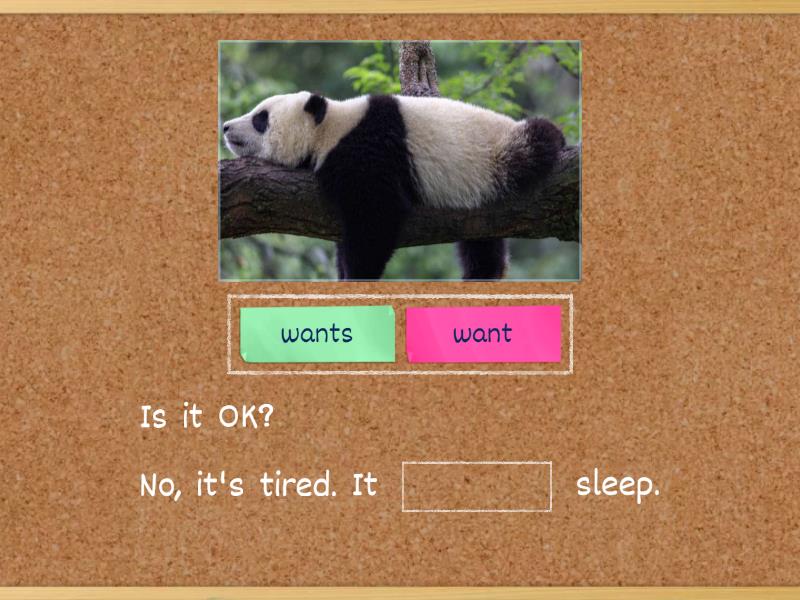 Is it OK? No, it's tired. It ____ sleep. Is she OK? No, she's hungry. She ____ food. Is he OK? No, he's thirsty. He ____ water. Are you OK? No, I'm hungry. I want ____. Are you OK? No, I'm thirsty. I want ____. Are you OK? No, I'm tired. I want ____. Are you OK? No, I'm ____. I want food. Are you OK? No, I'm ____. I want ____. Are you OK? No, I'm ____. I want sleep. Is he OK? No, ____ tired. He wants sleep. Is she OK? No, ____ hungry. She wants sleep. Are they OK? No, ____ thirsty. They want water. Are you OK? No, ____ tired. We want sleep.