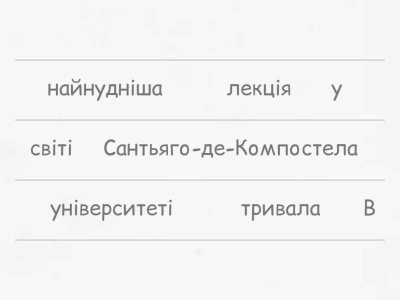 В університеті Сантьяго-де-Компостела тривала найнудніша лекція у світі, Викладач говорив щось про те, скільки гумусу є в різних ґрунтах світу., До речі, сьогодні починається програма для таких спеціалістів, як ви!, Можна зареєструватися на сайті й поїхати в якусь країну, яка є в цій програмі., Україна... Думка про неї крутилася в голові Беатріс до вечора., Та була одна проблема – мова., Браян заповнив заявку, вибрав Україну й клацнув на кнопку «надіслати»., Тріс без вагань завантажила перші три епізоди., В Україні неймовірно родюча земля., Це все тому, що шар гумусу там становить мінімум 30 сантиметрів..., Там ви будете досліджувати ґрунти й писати наукову роботу., Google – зручна пошукова система., Я без вагань погоджуюсь на будь-які цікаві пригоди., Я люблю подорожувати за кордон, світ такий різноманітний!, Вивчай землю і працюй на землі., Подальші дослідження будуть здійснюватись під керівництвом Всесвітньої організації охорони ґрунтів., Погортати книгу на вихідні – що може бути кращим., Самостійне життя має не тільки багато переваг, але й вимагає від людини великої відповідальності., Студентам з інших міст або іноземцям часто доводиться жити в гуртожитку., Якщо людина має поганий зір, вона мусить носити окуляри, але це ж додає вигляду людини поважності.,