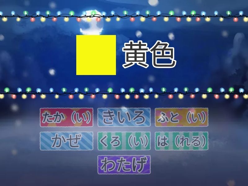 きいろ - 黄色, くろ(い) - 黒い, ふと(い) - 太い, わたげ - わた毛, たか(い) - 高い, かぜ - 風, は(れる) - 晴れる,