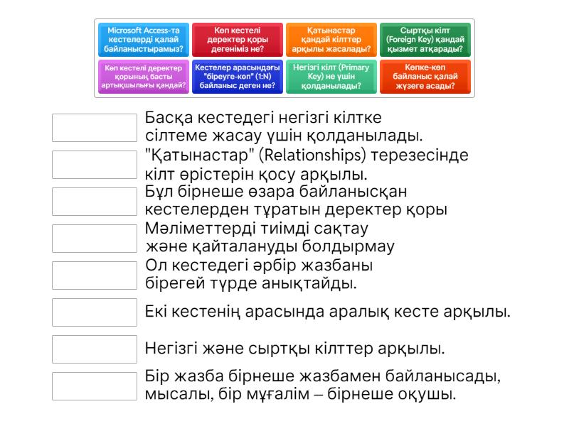 Көп кестелі деректер қоры дегеніміз не? - Бұл бірнеше өзара байланысқан кестелерден тұратын деректер қоры, Негізгі кілт (Primary Key) не үшін қолданылады? - Ол кестедегі әрбір жазбаны бірегей түрде анықтайды., Сыртқы кілт (Foreign Key) қандай қызмет атқарады? - Басқа кестедегі негізгі кілтке сілтеме жасау үшін қолданылады., Кестелер арасындағы "біреуге-көп" (1:N) байланыс деген не? - Бір жазба бірнеше жазбамен байланысады, мысалы, бір мұғалім – бірнеше оқушы., Microsoft Access-та кестелерді қалай байланыстырамыз? - "Қатынастар" (Relationships) терезесінде кілт өрістерін қосу арқылы., Қатынастар қандай кілттер арқылы жасалады? - Негізгі және сыртқы кілттер арқылы., Көпке-көп байланыс қалай жүзеге асады? - Екі кестенің арасында аралық кесте арқылы., Көп кестелі деректер қорының басты артықшылығы қандай? - Мәліметтерді тиімді сақтау және қайталануды болдырмау,