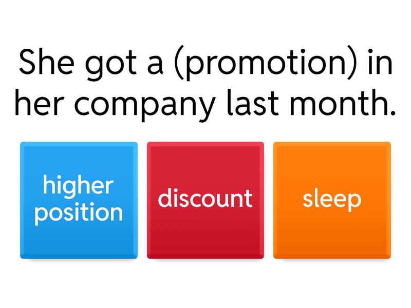 1) She got a (promotion) in her company last month. a) higher position b) discount c) sleep 2) Don't {worry} too much about the test a) relax b) feel anxious c) laugh 3) He felt (unprepared) for the exam a) not ready b) very excited c) very smart 4) I had a strange (dream) last night a) nightmare b) image in sleep c) hope 5) The car went (out of control) on the icy road a) under control b) fast c) not under control 6) He needs to (make a decision) soon a) delay the plan b) choose what to do c) forget everything 7) She has a lot of (confidence) in her ideas a) belief in herself b) fear c) confusion 8) Giving a speech can be (stressful) a) funny b) relaxing c) causing stress 9) This new job opens up many exciting (possibilities) a) problems b) opportunities c) questions 10) He lost (control) of the car during the storm. a) command b) direction c) power