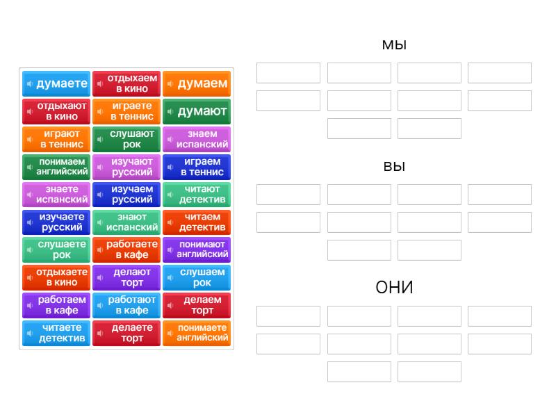 мы: понимаем английский, читаем детектив, играем в теннис, работаем в кафе, изучаем русский, слушаем рок, отдыхаем в кино, делаем торт, знаем испанский, думаем, вы: понимаете английский, читаете детектив, играете в теннис, работаете в кафе, изучаете русский, слушаете рок, отдыхаете в кино, делаете торт, знаете испанский, думаете, ОНИ: понимают английский, читают детектив, играют в теннис, работают в кафе, изучают русский, слушают рок, отдыхают в кино, знают испанский, думают, делают торт,