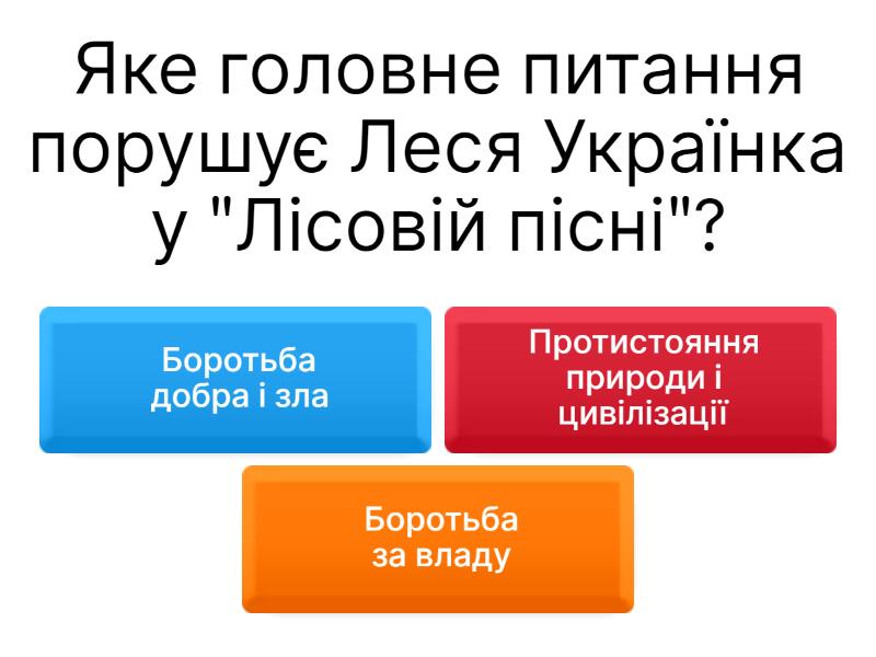 1) Яке головне питання порушує Леся Українка у "Лісовій пісні"? a) Боротьба добра і зла b) Протистояння природи і цивілізації c) Боротьба за владу 2) Що сталося з Лукашем у другій половині твору? a) А) Перетворився на вовкулаку b) Б) Перетворився на дерево c) В) Вмер 3) Що символізує сопілка у творі? a) А) Життя b) Б) Кохання і душу c) В) Хитрість 4) Що сталося з Мавкою після зради Лукаша? a) А) Вона стала русалкою b) Б) Вона перетворилася на вербу c) В) Вона зникла 5) Якою була мета Лісовика? a) Відстояти гармонію природи b) Допомогти людям 6) У якому жанрі написана "Лісова пісня"? a) А) Поема b) Б) Драма-феєрія c) В) Казка 7) Хто допомагає Мавці у світі природи? a) Русалка b) Водяник c) Б) Перелесник d) Лісовик 8) На якому інструменті грав Лукаш? a) гітара b) А) Скрипка c) Б) Флейта d) В) Сопілка 9) Хто хотів, щоб Лукаш одружився з Килиною? a) Килина b) А) Дядько Лев c) Б) Мати Лукаша d) В) Лісовик 10) Хто сказав слова: "Ні, я жива! Я буду вічно жити!"? a) Килина b) А) Мати Лукаша c) Б) Русалка d) В) Мавка 11) Яке природне явище супроводжувало появу Перелесника? a) Сонце b) А) Дощ c) Б) Гроза d) В) Блискавка 12) Що символізує образ Килини? a) Кохання b) Чистоту душі c) Побутову обмеженість і користолюбство d) Свободу