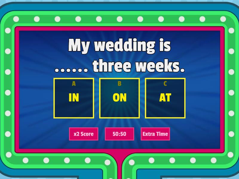 1) My wedding is ...... three weeks. a) IN b) ON c) AT 2) Do you go to the cinema ....... the weekend? a) IN b) ON c) AT 3) My grandmother was born ...... 1940 a) IN b) ON c) AT 4) I go to bed ...... midnight a) IN b) ON c) AT 5) She has classes ...... Saturday a) IN b) ON c) AT 6) Do you work ..... the evening? a) IN b) ON c) AT 7) They live ...... Italy a) IN b) ON c) AT 8) My birthday is ...... January a) IN b) ON c) AT 9) Holidays begin ...... Saturday. a) IN b) ON c) AT 10) Het gets up ...... 8 o'clock everyday a) IN b) ON c) AT 11) My English class starts ...... 7 pm. a) IN b) ON c) AT 12) We are staying ...... home because of the pandemic a) IN b) ON c) AT 13) He drinks coffee ..... the mornings. a) IN b) ON c) AT 14) My birthday is ..... December. a) IN b) ON c) AT 15) We go to the beach ...... Summer a) IN b) ON c) AT 16) The course starts ...... November. a) IN b) ON c) AT 17) What do you do ...... Wednesday? a) IN b) ON c) AT 18) I visit my parents ...... Christmas a) IN b) ON c) AT