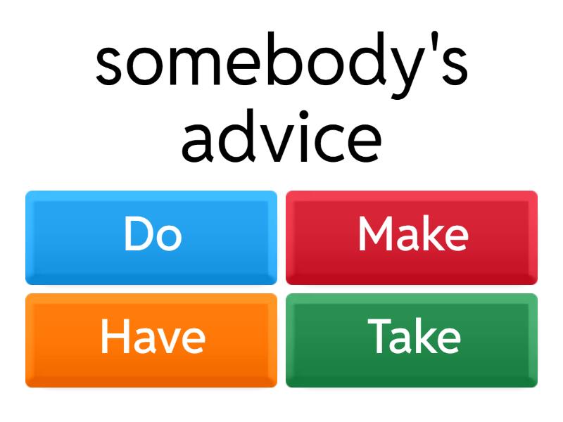 1) somebody's advice a) Do b) Make c) Have d) Take 2) an appointment a) Do b) Make c) Have d) Take 3) somebody a favour a) Do b) Make c) Have d) Take 4) breakfast a) Do b) Make c) Have d) Take 5) a conversation a) Do b) Make c) Have d) Take 6) the hoovering a) Do b) Make c) Have d) Take 7) the bed a) Do b) Make c) Have d) Take 8) nothing a) Do b) Make c) Have d) Take 9) the washing a) Do b) Make c) Have d) Take 10) a rest a) Do b) Make c) Have d) Take 11) friends a) Do b) Make c) Have d) Take 12) one's best a) Do b) Make c) Have d) Take 13) the rubbish out a) Do b) Make c) Have d) Take 14) a mistake a) Do b) Make c) Have d) Take 15) lunch a) Do b) Make c) Have d) Take 16) a photo a) Do b) Make c) Have d) Take 17) medicine a) Do b) Make c) Have d) Take