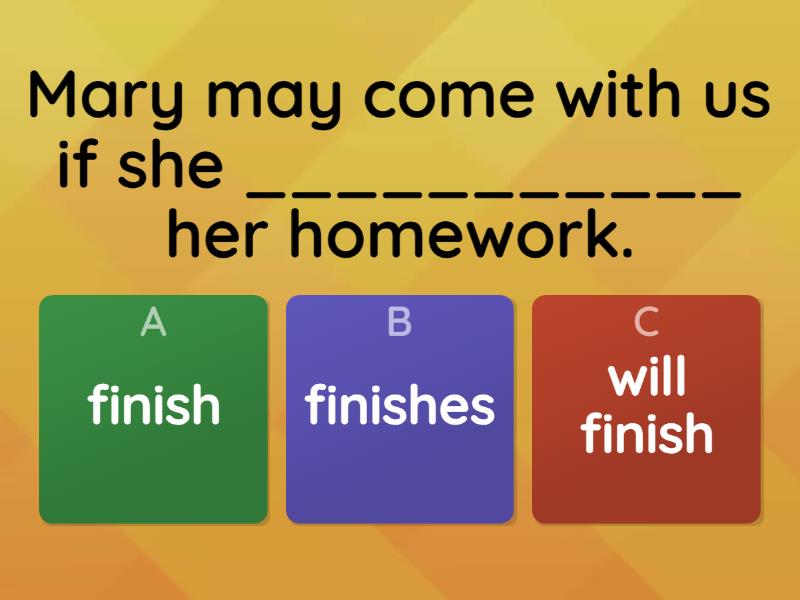 1) Mary may come with us if she ___________ her homework. a) finish b) finishes c) will finish 2) I’ll be back as soon as the meeting ____________ over. a) will be b) be c) is 3) Unless Andy _____________ soon, he will miss the show. a) doesn't come b) will come c) comes 4) Before John comes home, he _____________ to the supermarket. a) will go b) went c) doesn't come 5) Take the bus if you _____________ to be late. a) want b) won't want c) don't want 6) If you ________________ down, I won’t be able to understand what you’re saying. a) won't calm b) don't calm c) not calm 7) After we _____________________ the National Park, we’ll return to our campsite. a) visit b) will visit c) won't visit 8) As soon as Nathan and Ian ______________________ on a holiday destination, they’ll buy their tickets. a) won't decide b) will decide c) decide