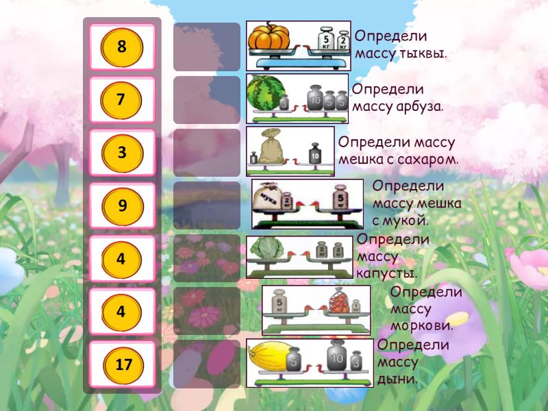 Определи массу моркови., Определи массу мешка с мукой., Определи массу капусты., Определи массу арбуза., Определи массу дыни., Определи массу мешка с сахаром., Определи массу тыквы.,