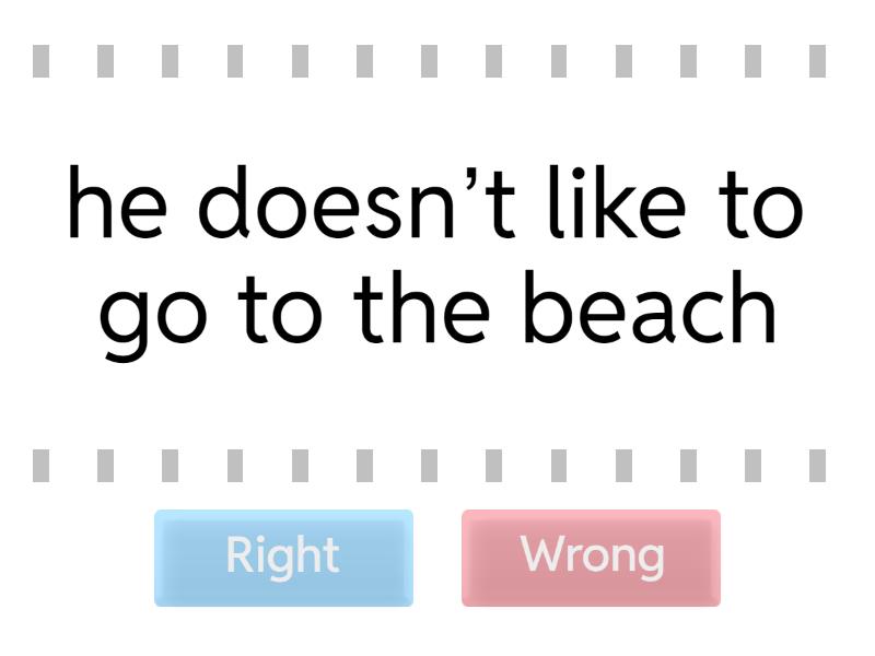 Right: he doesn’t like to go to the beach, your grandma has a car, my friend plays tennis every Tuesday, She goes to school on week days, They have to do their homework, he doesn't go to work by car, Wrong: my mom work everyday, your brother like Naruto, they doesn’t live in a house, she don't need to go to the bathroom, He have a car, She sleep a lot, she don’t have to do homework today, She don’t live in an apartment,
