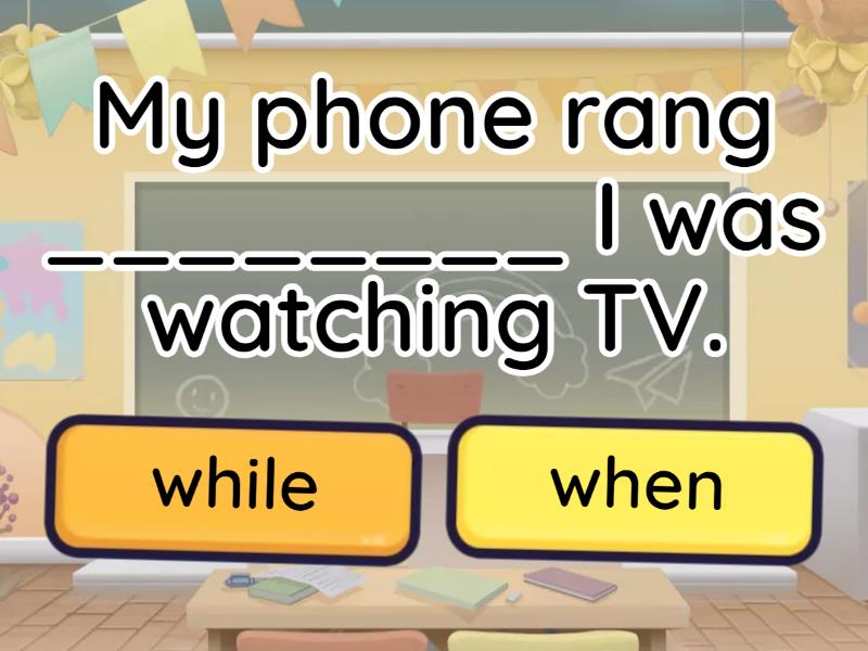 1) My phone rang ________ I was watching TV. a) while b) when 2) It was sunny _______ my uncle arrived. a) when b) while 3) Peter fell down ________ he was running a) when b) while 4) Tim came to my house ___________ I was sleeping. a) when b) while 5) We were eating ________ you came. a) when b) while 6) The girls were reading ___________ we arrived. a) when b) while 7) The boys were playing baseball ________ we brought the food. a) when b) while 8) Sam saw the butterfly ___________ he was opening the drawer. a) when b) while 9) My mom was cleaning the living room _________ she saw the cockroach. a) when b) while 10) I was studying __________ you called. a) when b) while 11) Tim sneezed ___________ he was singing wonderfully. a) while b) when 12) Becky broke a tooth __________ she was eating dumplings. a) when b) while 13) The prince was bouncing a ball __________ he fell down. a) when b) while 14) The monster will take a picture __________ the eagle gets the heart. a) while b) when 15) I was running __________ I fell. a) when b) while 16) I was doing my homework __________ Dad came home. a) whille b) when 17) Tina saw a sign __________ she was riding her bike. a) when b) while 18) Anna put away the prize __________ the people were fighting. a) while b) when 19) We were playing a game__________ we saw a monster. a) when b) while 20) I am going to plant a tree __________ Mom goes inside. a) while b) when 21) The duck hit the house __________ it was flying. a) while b) when 22) Paul bought a cold drink __________ he was walking to school. a) while b) when