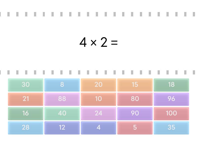 8 - 4 × 2 =, 80 - 10 × 8 =, 20 - 5 × 4 =, 18 - 2 × 9 =, 88 - 8 × 11 =, 4 - 4 × 1 =, 30 - 10 × 3 =, 10 - 5 × 2 =, 96 - 8 × 12 =, 28 - 4 × 7 =, 100 - 10 × 10 =, 15 - 3 × 5 =, 16 - 8 × 2 =, 24 - 3 × 8 =, 12 - 4 × 3 =, 40 - 10 × 4 =, 21 - 3 × 7 =, 90 - 10 × 9 =, 35 - 5 × 7 =, 5 - 5 × 1 =,