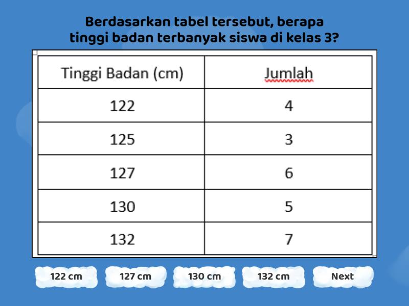 1) Berdasarkan tabel tersebut, berapa tinggi badan terbanyak siswa di kelas 3? a) 122 cm b) 127 cm c) 130 cm d) 132 cm e) Next 2) Selisih jumlah siswa yang tinggi badan tertinggi dan tinggi badan terendah adalah … a) 2 b) 3 c) 4 d) 5 e) Next 3) Banyak siswa yang mendapat nilai 87 adalah … siswa a) 3 b) 4 c) 5 d) 6 e) Next 4) Banyak siswa kelas 3 yang mengikuti ulangan matematika adalah ... siswa a) 27 b) 26 c) 25 d) 24 e) Next 5) Berdasarkan diagram batang tersebut, hewan peliharan tebanyak yang dimiliki oleh siswa kelas 3 adalah ... a) Ikan b) Kucing c) Kelinci d) Burung e) Next