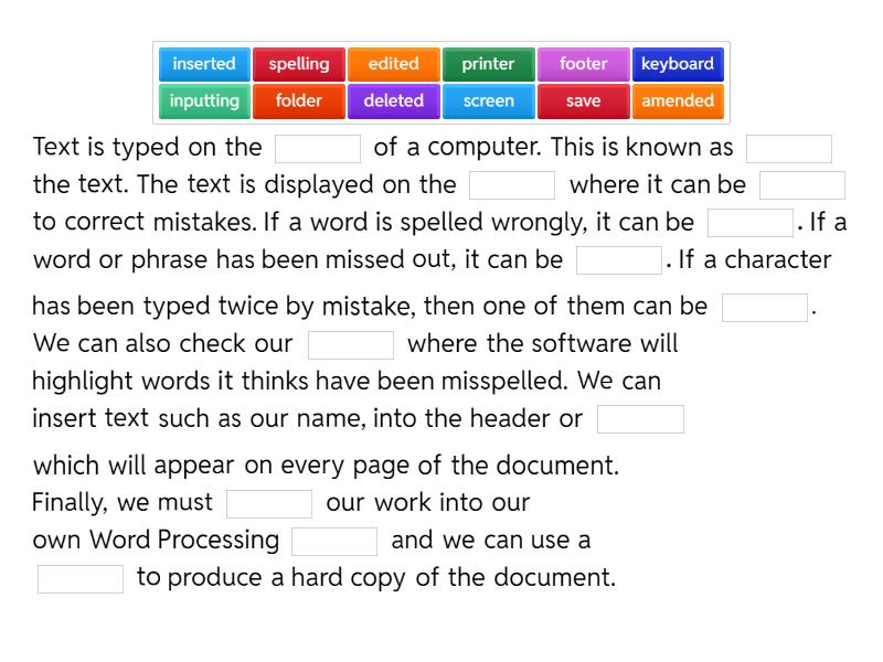Text is typed on the ____ of a computer. This is known as ____ the text. The text is displayed on the ____ where it can be ____ to correct mistakes. If a word is spelled wrongly, it can be ____. If a word or phrase has been missed out, it can be ____. If a character has been typed twice by mistake, then one of them can be ____. We can also check our ____ where the software will highlight words it thinks have been misspelled. We can insert text such as our name, into the header or ____ which will appear on every page of the document. Finally, we must ____ our work into our own Word Processing ____ and we can use a ____ to produce a hard copy of the document.