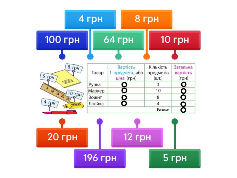 4 грн, 10 грн, 8 грн, 5 грн, 12 грн, 100 грн, 64 грн, 20 грн, 196 грн.