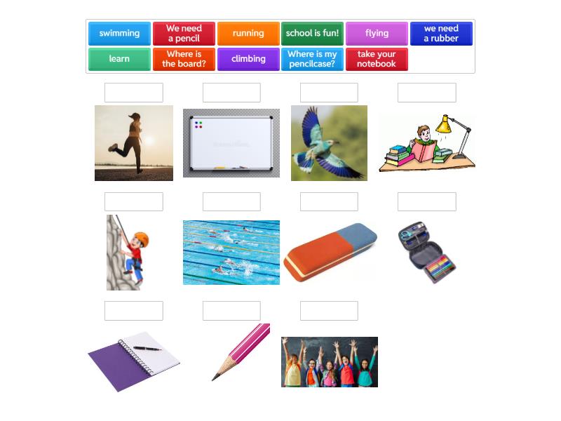 school is fun!, We need a pencil, we need a rubber, take your notebook, Where is the board?, Where is my pencilcase?, swimming, running, flying, climbing, learn,