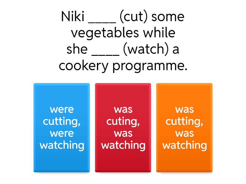 1) Niki ____ (cut) some vegetables while she ____ (watch) a cookery programme. a) were cutting, were watching b) was cuting, was watching c) was cutting, was watching 2) Peter ____(play) music loudly while his neighbour ______ (try) to sleep. a) played, tried b) was playing, was trying c) were playing, were trying 3) Th Chan family ____ (listen) to music while they _____(have) a barbecue. a) was listening, was having b) were listening, were having c) listened, had 4) Mrs Wong _____ (talk) to her son while she _____ (cook) noodles. a) was talking, was cooking b) were talking, were cooking c) talked, cooked 5) Ben and his friends _____ (play) football while it _____ (rain) heavily. a) was playing, were raining b) were playing, rained c) were playing, was raining