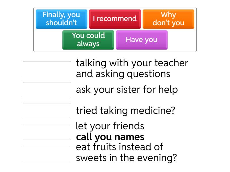 Have you - tried taking medicine? , I recommend - talking with your teacher and asking questions, Why don't you - eat fruits instead of sweets in the evening?, You could always - ask your sister for help , Finally, you shouldn't - let your friends call you names,