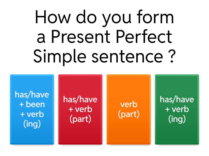 1) How do you form a Present Perfect Simple sentence ? a) has/have + been + verb (ing) b) has/have + verb (part) c) verb (part) d) has/have + verb (ing) 2) How do you form a present perfect continuous sentence ? a) has/have + verb (ing) b) has/have + been + verb (part) c) has/have + been + verb (ing) d) has/have + verb (part) 3) Which are the key words for present perfect simple ? a) always b) lately c) so far d) Never e) this month 4) Do we use present perfect simple for experiences? a) yes b) no 5) Which are the key words for present perfect continuous ? a) ever , never, always . b) recently , lately .