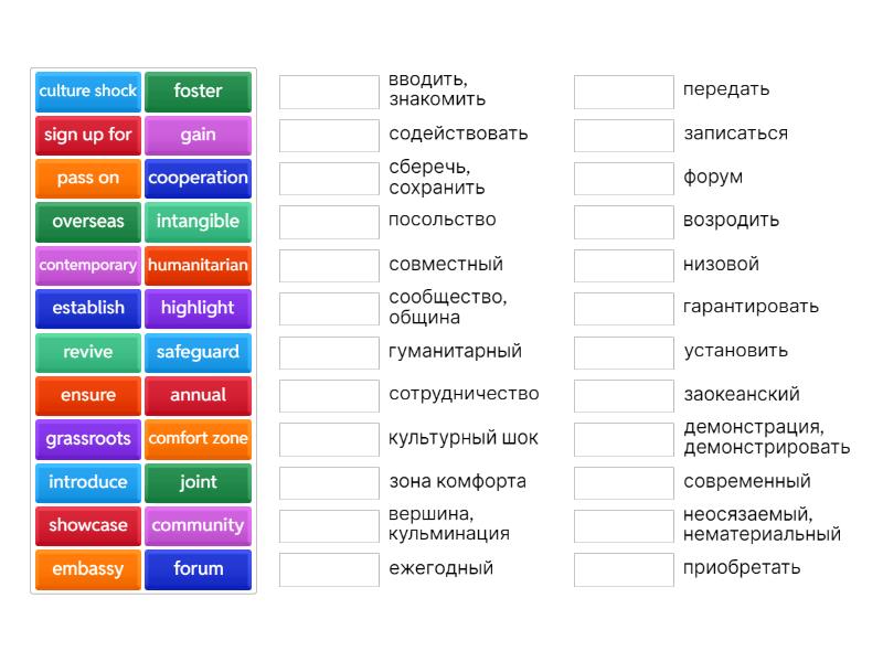 annual - ежегодный, comfort zone - зона комфорта, community - сообщество, община, contemporary - современный, cooperation - сотрудничество, culture shock - культурный шок, embassy - посольство, ensure - гарантировать, establish - установить, forum - форум, foster - содействовать, gain - приобретать, grassroots - низовой, highlight - вершина, кульминация, humanitarian - гуманитарный, introduce - вводить, знакомить, intangible - неосязаемый, нематериальный, joint - совместный, overseas - заокеанский, pass on - передать, revive - возродить, safeguard - сберечь, сохранить, showcase - демонстрация, демонстрировать, sign up for - записаться,