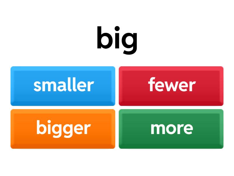 1) big a) smaller b) fewer c) bigger d) more 2) small a) shorter b) smaller c) bigger d) more 3) tall a) fewer b) taller c) older d) longer 4) short a) longer b) better c) greater d) shorter 5) long a) smaller b) longer c) less d) bigger 6) old a) worse b) older c) shorter d) taller 7) many a) more b) worse c) longer d) less 8) few a) less b) worse c) longer d) fewer 9) great a) taller b) better c) more d) greater 10) little a) longer b) fewer c) greater d) less 11) good a) longer b) less c) better d) taller 12) bad a) worse b) greater c) older d) fewer
