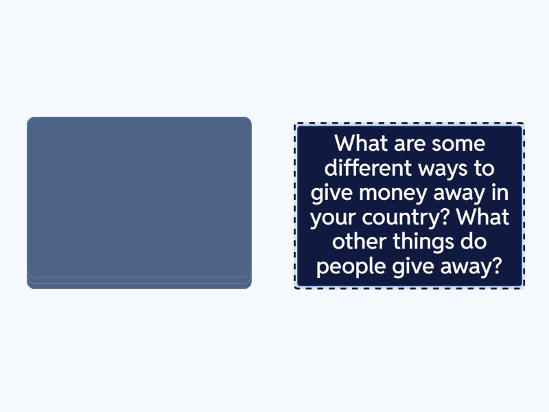 Does money make people happy? Why? Why not?, Can having a lot of money be a problem for some people? How?, If you give money away, how can it help you as well as the person or organisation you give it to?, What are some different ways to give money away in your country? What other things do people give away?.