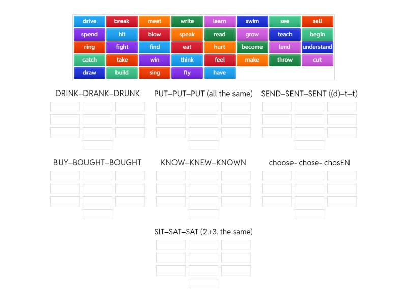 DRINK–DRANK–DRUNK: sing, swim, begin, ring, PUT–PUT–PUT (all the same): hit, cut, hurt, read, SEND–SENT–SENT ((d)–t–t): build, spend, lend, BUY–BOUGHT–BOUGHT: fight, teach, catch, think, KNOW–KNEW–KNOWN: grow, throw, fly, draw, blow, choose- chose- chosEN: take, see, eat, write, drive, break , speak, SIT–SAT–SAT (2.+3. the same): win, make, find, learn, become, have, meet, sell, understand, feel,