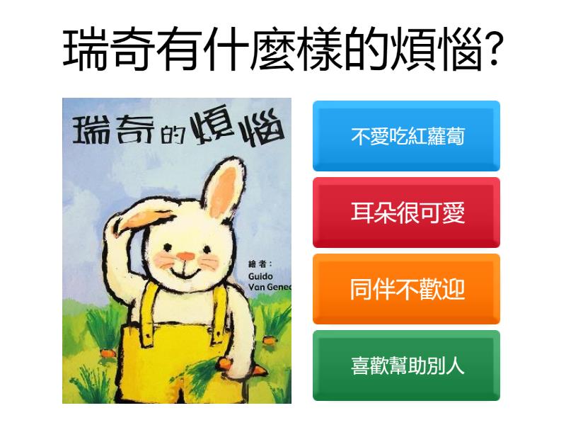 1) 瑞奇有什麼樣的煩惱? a) 不愛吃紅蘿蔔 b) 耳朵很可愛 c) 同伴不歡迎 d) 喜歡幫助別人 2) 這本故事書告訴我們什麼重要的事? a) 謊話蟲喜歡吃沙發 b) 謊話蟲喜歡小朋友 c) 小朋友要養謊話蟲 d) 小朋友不能說謊話 3) 讀了這本書,我可以怎麼做?(答案不只一個) a) 我需要爸爸媽媽幫我整理書包 b) 每天都要謝謝爸爸媽媽幫我許多事情 c) 我的爸爸媽媽是萬能工具,照顧我的生活 d) 爸爸媽媽很嘮叨,總是碎念許多事情 4) 如果學校真的出現一隻"大狐狸",我該怎麼辦?(答案不只一個) a) 告訴老師和爸爸媽媽,請他們幫我 b) 我也會怕,所以不能說 c) 我也要當大狐狸 d) 幫助被欺負的同學 5) 參加有聲書展,要注意什麼事情? a) 可以離開座位跟別人換平板 b) 把聲音放出來大家一起聽 c) 仔細聽故事並看著書中的故事 d) 我喜歡坐在沙發聽故事 6) 圖書館的書,不小心撕破了怎麼辦? a) 噓!不要說就沒人知道 b) 自己找膠帶黏起來 c) 沒關係的,撕乾淨一點 d) 找志工媽媽幫忙 7) 走進圖書館要遵守那些規矩?(答案很多個) a) 安安靜靜找自己的書 b) 在櫃檯借書和還書 c) 玩躲貓貓或追逐 d) 看見同學在玩要提醒他們 e) 要慢慢走不能跑 f) 記得代讀書存摺借書