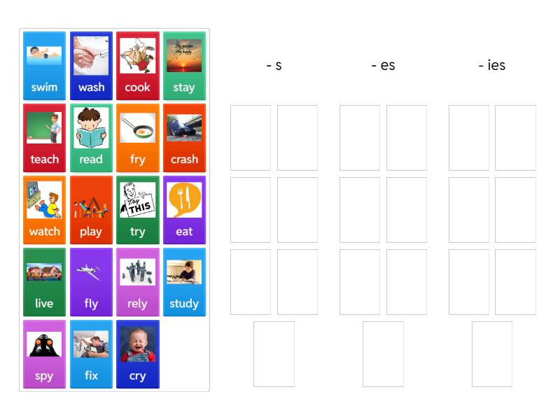- s: read, swim, play, eat, cook, live, stay, - es: watch, teach, wash, fix, crash, - ies: fly, cry, fry, study, try, spy, rely,