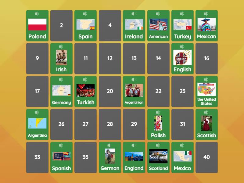 England - English, Ireland - Irish, Poland - Polish, Scotland - Scottish, Spain - Spanish, Turkey - Turkish, Germany - German, Mexico - Mexican, the United States - American, Argentina - Argentinian, Brazil - Brazilian, Egypt - Egyptian, Hungary - Hungarian, Italy - Italian, Russia - Russian, China - Chinese, Japan - Japanese, the Czech Republic - Czech, France - French, Switzerland - Swiss,