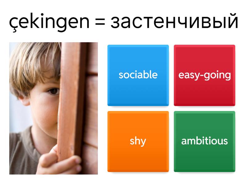 1) çekingen = застенчивый a) sociable b) easy-going c) shy d) ambitious 2) iletişimci = общительный a) reliable b) sociable c) shy d) ambitious 3) neşeli = радостный a) easy-going b) cheerful c) impatient d) hard-working 4) güvenilir = надежный a) hard-working b) mean c) independent d) reliable 5) çalışkan -= трудолюбивый a) sociable b) hard-working c) moody d) shy 6) sabırsız = нетерпеливый a) caring b) impatient c) reliable d) cheerful 7) hırslı = целеустремленный a) ambitious b) caring c) hard-working d) moody 8) Uyumlu = легкий и приятный в общении a) moody b) caring c) hard-working d) easy-going 9) bağımsız = независимый a) cheerful b) mean c) ambitious d) independent 10) Dengesiz, kaprisli = капризный, не в настроении a) hard-working b) easy-going c) independent d) moody 11) Kötü, cimri = гадкий, противный a) hard-working b) moody c) mean d) cheerful 12) Şefkatli = заботливый a) caring b) independent c) impatient d) easy-going 13) buyurgan = любящий командовать a) bossy b) selfish c) untidy d) caring