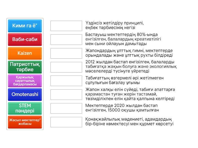 Omotenashi - Қонақжайлылық мәдениеті, адамдардың бір-біріне көмектесуі мен құрмет көрсетуі, Kaizen - Үздіксіз жетілдіру принципі, еңбек тәрбиесінің негізі, STEM пәндері - Бастауыш мектептердің 80%-ында енгізілген, балалардың креативтілігі мен сыни ойлауын дамытады, Қаржылық сауаттылық бағдарламасы - Мектептерде 2020 жылдан бастап енгізілген, 15000 оқушы қамтылған, Жасыл мектептер” жобасы - 2012 жылдан бастап енгізілген, балаларды табиғатқа жақын болуға және экологиялық мәселелерді түсінуге үйретеді, Кими га ё” - Жапондардың ұлттық гимні, мектептерде орындалады және ұлттық рухты білдіреді, Патриоттық тәрбие - Жапон халқы елін сүйеді, табиғи апаттарға қарамастан туған жерін тастамай, төзімділікпен елін қайта қалпына келтіреді, Ваби-саби - Табиғаттың өзгермелі әрі жетілмеген сұлулығын бағалау ұғымы,