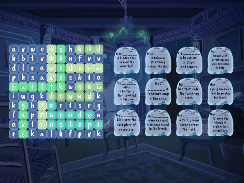 flew - Max ______ through the clouds in a giant hot air balloon., rode - He ______ a tall, brown horse across the field., found - Max ______ a hidden door behind the waterfall., built - He ______ a house out of sticks and leaves., ate - Max ______ a jelly sandwich that he packed for lunch., ran - He ______ after a butterfly that sparkled in the sun., saw - Max ______ a rainbow stretching across the sky., gave - He ______ his sister the last piece of chocolate., drew - Max ______ a treasure map in the sand., slept - He ______ in a tent under the twinkling stars., hid - Max ______ when he heard a strange sound in the forest., shook - He ______ hands with a talking owl who promised to help.,