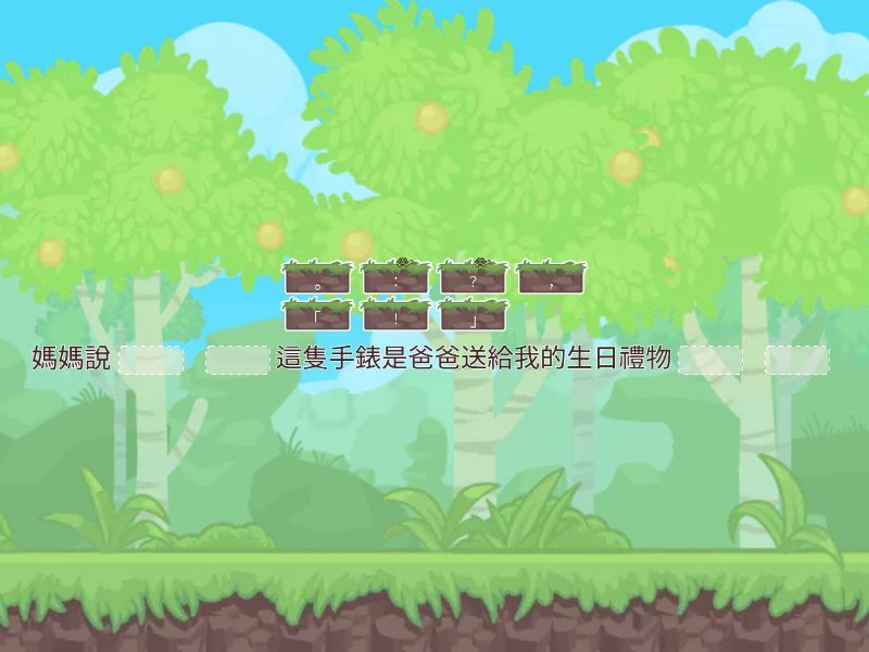 媽媽說____ ____這隻手錶是爸爸送給我的生日禮物____ ____ 紅的花、 綠的草____灣灣的小河____多美麗的大自然啊____ 倫敦、東京____上海____都是世界上著名的國際大都會____ 圖書館的圖書真多____有小說____童話、漫畫____真是多不勝數啊____ 正當妹妹說____ ____我們一起____ ____哥哥便打斷了她的話____ 小志慚愧地說____ ____對不起____我不小心打破了花瓶____ ____ 整個歐洲共有四十多個國家____包括英國____德國、西班牙____ ____ 哥哥對我說____ ____這場足球比賽真刺激____ ____ 這些出淤泥而不染的花____荷花,開得很燦爛____芳香撲鼻,格外招人喜愛____ 他很有愛心____每個星期六都抽空去做義工____賣旗____ 動物園的老虎有的閃着兇光____有的露出尖刀般的牙齒,有的大聲吼叫着____ 大家叫他____智多星____,因為無論遇到甚麼難題____他都能很快把它們解決____ 今年的賀歲煙火匯演異常精彩____有____飛龍在天____ ____「炮聲龍龍」 ____ 夜空中綻放的煙火給香港增添了亮麗姿彩____ 我報名學書法____所以爸爸給我買了文房四寶____紙、筆____墨、硯____ 這次籌款活動很成功____你知道是誰組織的嗎____是我們的校長____陳校長____ 候鳥____在冬天來臨前遷徙到南方____並在第二年春天才飛回北方的鳥類____ 每天早上 ,外公都會在星光酒樓一邊喝早茶____一邊看____每日日報____呢____ 我家的大姐姐是 ____ 書蟲 ____ ____她整天都躲在房間裏看書____ 今 天 ____ 老 師 教 導 我 彈 奏____ 夢 中 的 婚 禮____ 這 首 樂 曲 ____ 小俊_專名號_問小明_專名號_ :「你看過金庸____先生所寫的____射鵰英雄傳____嗎____ 張秋生____是著名的兒童文學作家,他創作了不少出色的兒童文學作品____如《校園裡的薔薇花 ____ 和____小巴掌童話百篇 ____