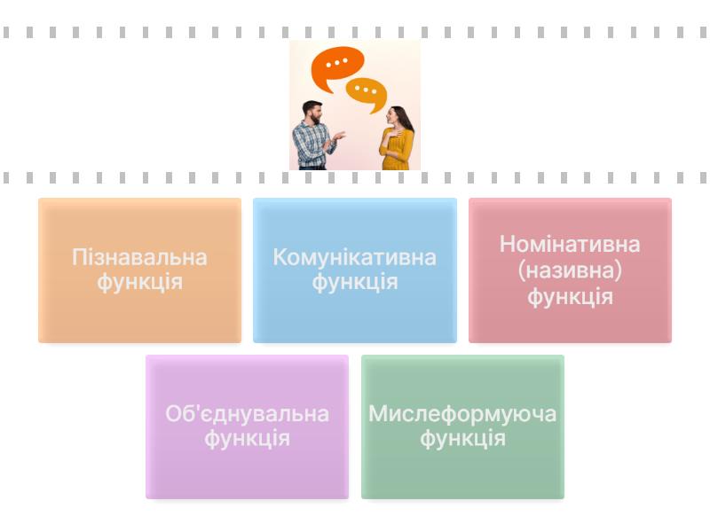 Комунікативна функція, Номінативна (називна) функція, Пізнавальна функція, Мислеформуюча функція, Об'єднувальна функція,