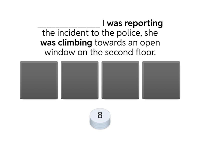 1) ______________ I was reporting the incident to the police, she was climbing towards an open window on the second floor. a) While b) When c) when d) while 2) I was walking along the street opposite the school _______________ I saw a woman in black clothes climbing up the scaffolding like a cat. a) when b) while c) When d) While 3) What ___________ the manager __________ ______________ the man fell? a) was; do; while b) was; doing; while c) were; doing; when d) was; doing; when 4) What ___________ the police __________ when one of them _______________(drop) a necklace? a) was; do; drop b) was; doing; drop c) was; doing; dropped d) was; doing; droped 5) What _________ the children ______________ while you __________________(drive) the car? a) was; doing; was driving b) was; doing; were driving c) were; doing; were driving d) were; do; were driving