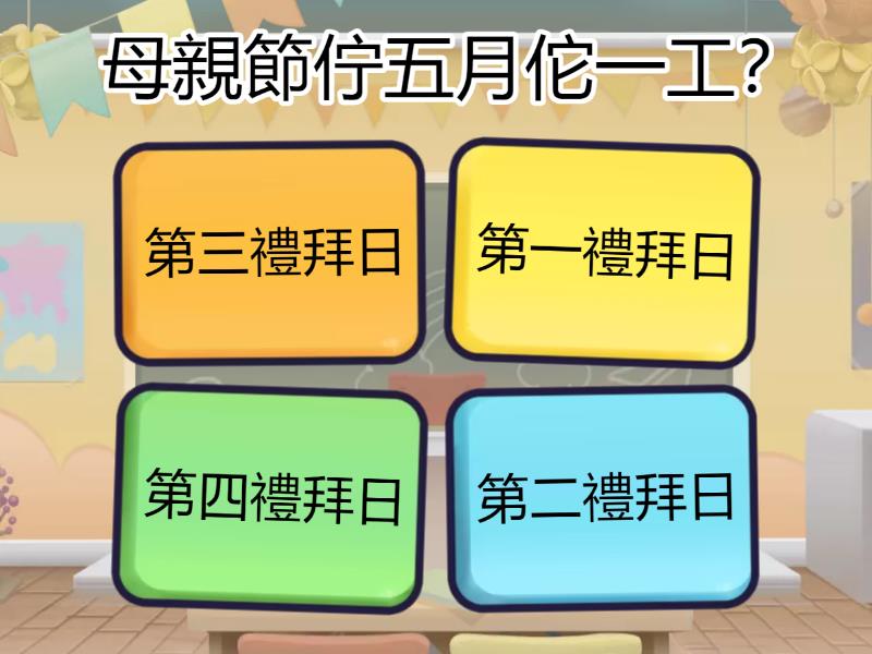 1) 母親節佇五月佗一工? a) 第一禮拜日 b) 第二禮拜日 c) 第三禮拜日 d) 第四禮拜日 2) 佇外國,母親節的代表花是什麼? a) 玫瑰花 b) 菊花 c) 剪絨仔花 d) 蓮花 3) 母親節是對佗一國來的? a) 英國 b) 法國 c) 德國 d) 美國 4) 佇台灣,母親節的代表花是什麼? a) 玫瑰花 b) 佈田花/杜鵑花 c) 金針花 d) 鼓吹花/牽牛花 5) 佗一個毋是「媽媽」的閩南語? a) 阿母 a-bú b) 娘嬭 niû-lé c) 阿娘 a-niâ d) 娘仔 niû-á