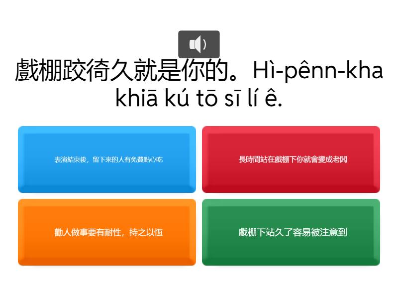 1) 戲棚跤徛久就是你的。Hì-pênn-kha khiā kú tō sī lí ê. a) 表演結束後,留下來的人有免費點心吃 b) 長時間站在戲棚下你就會變成老闆 c) 勸人做事要有耐性,持之以恆 d) 戲棚下站久了容易被注意到 2) 烏仔魚搢水。Oo-á-hî tsìnn tsuí. a) 人人各有才能 b) 不畏困難,積極向上 c) 天生我材必有用 3) 三跤步一坎店。Sann kha-pōo tsi̍t khám tiàm. a) 指同類的店鋪多,同行之間競爭激烈 b) 形容人腳步很快,急促容易跌倒 c) 市景繁榮,商店林立 4) 雞卵密密也有縫。Ke-nn̄g ba̍t-ba̍t iā ū phāng. a) 雞蛋裡挑骨頭,比喻吹毛求疵 b) 比喻事情總會有破綻,不可能天衣無縫 c) 比喻事情有機可乘 5) 徛懸山,看馬相踢。Khiā kuân suann, khuànn bé sio-that. a) 比喻置身事外,有幸災樂禍之意 b) 懸崖勒馬,比喻從頭做起,一切還來得及 c) 面對危急時刻,互相推託 6) 驚驚袂著等。Kiann-kiann bē tio̍h-tíng. a) 做事要小心謹慎,不著急 b) 勸人做事要果決,不要畏畏縮縮 7) 講著食,舂破額。Kóng-tio̍h tsia̍h, tsing-phuà hia̍h. a) 一聽到有東西吃就爭先恐後,把額頭都撞破 b) 時常為了要吃什麼而感到苦惱 c) 比喻人們為了爭權奪利而不顧形象的模樣 8) 敢做匏桸,就毋通驚水燙。Kánn tsò pû-hia, tō m̄-thang kiann tsuí thǹg. a) 主動積極,有機會要主動把握 b) 承擔了責任就要敢做敢當,不要畏首畏尾