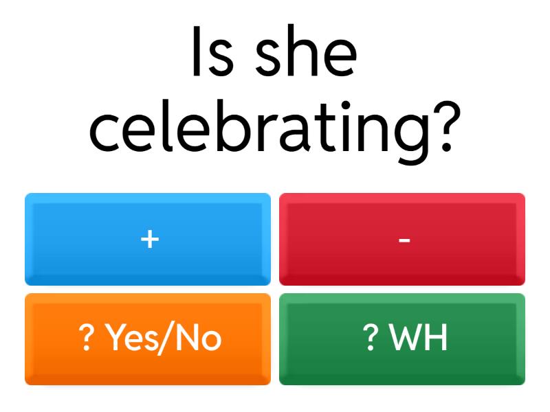 1) Is she celebrating? a) + b) - c) ? Yes/No d) ? WH 2) How are you traveling? a) + b) - c) ? Yes/No d) ? WH 3) Where are you going? a) + b) - c) ? Yes/No d) ? WH 4) It is raining. a) + b) - c) ? Yes/No d) ? WH 5) They are talking, a) + b) - c) ? Yes/No d) ? WH 6) I am not cooking. a) + b) - c) ? Yes/No d) ? WH 7) Is she drawing? a) + b) - c) ? Yes/No d) ? WH 8) Are you having breakfast? a) + b) - c) ? Yes/No d) ? WH 9) She isn't laughing. a) + b) - c) ? Yes/No d) ? WH 10) You are not watching TV. a) + b) - c) ? Yes/No d) ? WH 11) He is being kind. a) + b) - c) ? Yes/No d) ? WH 12) I am studying Japanese. a) + b) - c) ? Yes/No d) ? WH 13) Where is it raining? a) + b) - c) ? Yes/No d) ? WH 14) Why is he laughing? a) + b) - c) ? Yes/No d) ? WH 15) Is he listening to music? a) + b) - c) ? Yes/No d) ? WH 16) She is going to the gym. a) + b) - c) ? Yes/No d) ? WH 17) Why are you leaving? a) + b) - c) ? Yes/No d) ? WH 18) He isn't running. a) + b) - c) ? Yes/No d) ? WH 19) Am I winning? a) + b) - c) ? Yes/No d) ? WH 20) We aren't eating avocado. a) + b) - c) ? Yes/No d) ? WH 21) It's not snowing. a) + b) - c) ? Yes/No d) ? WH 22) We are eating icecream. a) + b) - c) ? Yes/No d) ? WH 23) Where is she studying? a) + b) - c) ? Yes/No d) ? WH 24) Are they waiting? a) + b) - c) ? Yes/No d) ? WH