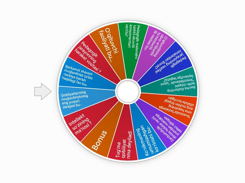 1) Barkamol shaxsni rivojlantirish ta'lim -tarbiya berish haqidagi fan bu- a) Pedagogika b) Tarix 2) Pedagogik jarayonning harakat vositasi ? a) Faoliyat b) Pedagogik oʻzaro ta'sir 3) Oʻqituvchi faoliyati bu... a) Pedagogik jarayonning harakat vositasi b) Pedagogik faoliyat 4) Pedagogik mahoratni tashkil etuvchi komponentlari nechta? a) 6 ta b) 4ta 5) Oʻqituvchining obroʻ-eʼtiborini taʼminlovchi ilk vositasi bu- a) Ilmi b) Tarbiyalanganlik darajasi 6) Pedagogik jarayonning vazifasi nimalardan iborat? a) Bilim berish, tarbiyalash, rivojlantirish b) Bilim,koʻnikma va malaka hosil qilish 7) Barcha illatlarning kelib chiqishi "ilmsizlikdandir "qaysi faylasufga tegishli? a) Demosfen b) Suqrot 8) "Avestoda"bolalarga nma hayotning eng muhim tirgagi sifatida koʻrilgan a) Bilim b) Bilim va tarbiya 9) Zardushdiylik dinida bolalar nechi yoshdan maktabga qabul qilingan a) 7 yosh b) 5 yosh 10) Koʻnikmaning umumlashgan koʻrinishi bu- a) Mohirlik b) Mahorat 11) Tugʻma qobiliyat nma deyiladi a) Bilim b) Zehn 12) Bonus a) Kanfet b) Shokalat 13) Intellekt soʻzining ma'nosi ? a) Lotincha -anglash tushunish b) Lotincha -anglash,tushunish,egallash 14) Qobilyatlarning rivojlantirishning eng yuqori darajasi bu- a) Talant b) qobilyat