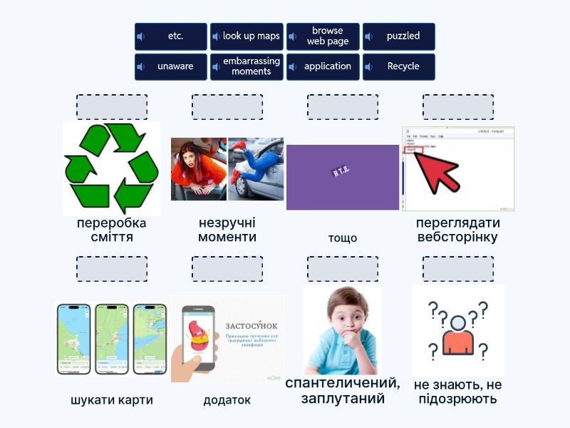 instant message someone - миттєве повідомлення комусь, look up maps - шукати карти, browse web page - переглядати вебсторінку, etc. - тощо, embarrassing moments - незручні моменти, unaware - не знають, не підозрюють, although - хоча, awkward - незручний, eagerly - з нетерпінням, smack-bang - точно, прямісінько, безпосередньо, mode - режим, puzzled - спантеличений, заплутаний, application - додаток, fence - паркан, caught up in - занурений, захоплений у , Recycle - переробкa сміття,