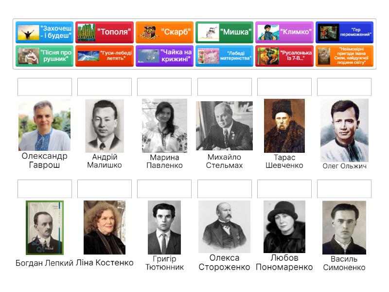 "Гуси-лебеді летять" - Михайло Стельмах, "Неймовірні пригоди Івана Сили, найдужчої людини світу" - Олександр Гаврош, "Климко" - Григір Тютюнник, "Скарб" - Олекса Стороженко, "Пісня про рушник" - Андрій Малишко, "Лебеді материнства" - Василь Симоненко, "Чайка на крижині" - Ліна Костенко, "Гер переможений" - Любов Пономаренко, "Захочеш - і будеш" - Олег Ольжич, "Мишка" - Богдан Лепкий, "Тополя" - Тарас Шевченко, "Русалонька із 7-В..." - Марина Павленко,