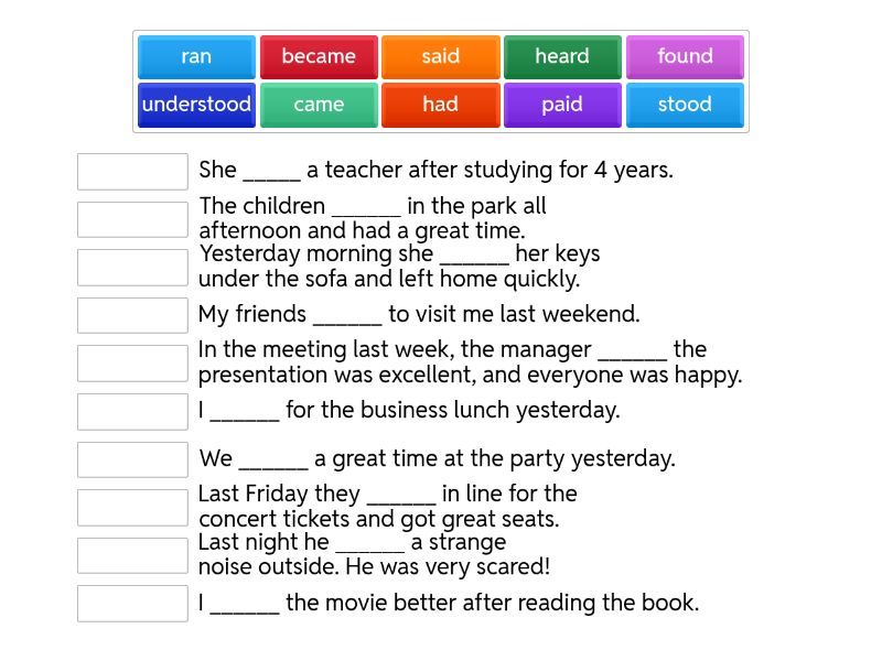 paid - I ______ for the business lunch yesterday., found - Yesterday morning she ______ her keys under the sofa and left home quickly., had - We ______ a great time at the party yesterday., heard - Last night he ______ a strange noise outside. He was very scared!, stood - Last Friday they ______ in line for the concert tickets and got great seats., understood - I ______ the movie better after reading the book., became - She _____ a teacher after studying for 4 years., came - My friends ______ to visit me last weekend., ran - The children ______ in the park all afternoon and had a great time., said - In the meeting last week, the manager ______ the presentation was excellent, and everyone was happy.,