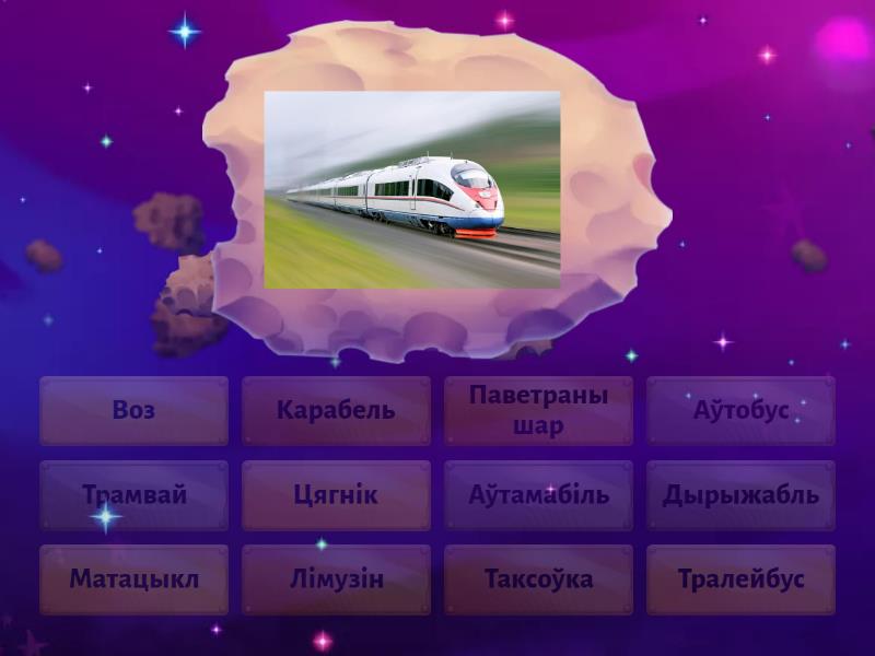 Цягнік, Аўтамабіль, Таксоўка, Тралейбус, Трамвай, Паветраны шар, Матацыкл, Аўтобус, Карабель, Воз, Дырыжабль, Лімузін,