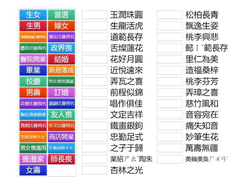 訂婚 - 文定吉祥, 結婚 - 花好月圓, 嫁女 - 之子于歸, 生男 - 弄璋之喜, 生女 - 弄瓦之喜, 男壽 - 松柏長青, 女壽 - 慈竹風和, 男女通用壽誕 - 萬壽無疆, 搬遷家 - 里仁為美, 新居落成 - 美輪美奐ㄏㄨㄢˋ, 作文比賽得名 - 妙筆生花, 書法比賽得名 - 鐵畫銀鉤, 音樂比賽得名 - 玉潤珠圓, 舞蹈比賽得名 - 飄逸生姿, 戲劇比賽得名 - 唱作俱佳, 演講辯論比賽得名 - 舌燦蓮花, 體育活動得名 - 生龍活虎, 校慶 - 桃李芬芳, 畢業 - 前程似錦, 當選 - 造福桑梓, 醫院開業 - 杏林之光, 商店開業 - 業紹ㄕㄠˋ陶朱, 飯店/旅館開業 - 近悅遠來, 男喪哀悼ㄉㄠˋ - 道範長存, 女喪哀悼ㄉㄠˋ - 懿ㄧˋ範長存, 男女喪通用 - 音容宛在, 友人喪 - 痛失知音, 師長喪 - 桃李興悲, 政界喪 - 忠勤足式,