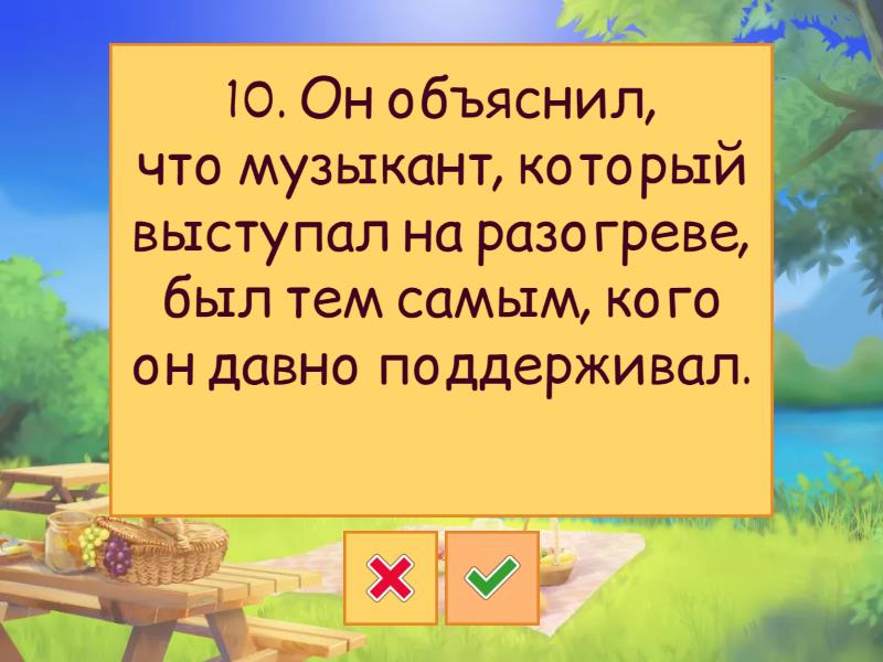 1. Завтра в это время мы будем осматривать уникальные достопримечательности, которые находятся в центре города. - 1. Tomorrow at this time we will be going sightseeing at the unique tourist attractions that are located in the central part of the city., 2. Он сказал, что его группа будет выступать на церемонии, которая будет проходить на площади. - 2. He said that his band would be performing at the ceremony, which would take place in the square., 3. Мы отправились в путешествие, о котором давно мечтали, и к тому времени уже забронировали жильё, в котором мы остановимся. - 3. We had already booked an accommodation where we would stay by the time we set off on the trip, which we had dreamed of for a long time., 4. Когда они добрались до туристической достопримечательности, они увидели, что там уже стоит невероятная очередь, которая казалась бесконечной. - 4. When they arrived at the tourist attraction, they saw that there was already an outstanding queue, which seemed endless., 5. Она заметила, что мужчина, который махал руками, что-то объяснял туристам, которые только что прилетели. - 5. She noticed that the man, who was gesturing, was explaining something to the tourists, who had just taken off., 6. К тому времени как они начали сдавать тест, я уже повторила весь материал, который мне нужен был для экзамена. - 6. By the time they started the test, I had already revised all the stuff that I needed for the exam., 7. Завтра мы отправимся в тропический лес, в который обычно приезжают те, кто любит экотуризм. - 7. Tomorrow we will set off for the tropical rainforest, which is usually visited by those who love environmental tourism., 8. Она рассказывала, как они планировали поездку, которая включала посещение удивительных мест и встречу с местными жителями. - 8. She was describing how they had been planning the trip, which included visiting stunning places and meeting locals., 9. Они решили уйти из группы, которая была слишком дезорганизованной, чтобы отправиться в самостоятельное путешествие. - 9. They decided to get away from the group, which was too disorganized, to go backpacking., 10. Он объяснил, что музыкант, который выступал на разогреве, был тем самым, кого он давно поддерживал. - 10. He explained that the musician, who was the support act, was the one he had supported for a long time.,