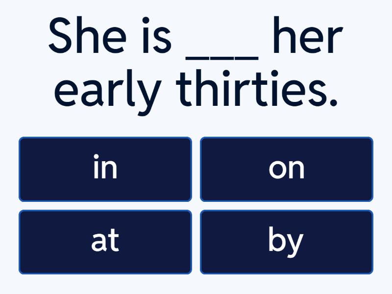 1) She is ___ her early thirties. a) in b) on c) at d) by 2) He is feeling ___ the weather. a) under b) over c) in d) on 3) Please bear ___ mind the deadline. a) in b) on c) at d) by 4) She can cope ___ stress well. a) with b) in c) on d) at 5) He deals ___ problems efficiently. a) with b) in c) on d) at 6) I am disappointed ___ the results. a) with b) in c) on d) at 7) I am disappointed ___ your behavior. a) with b) in c) on d) at 8) She is full ___ energy today. a) of b) in c) on d) at 9) Do you get along ___ your colleagues? a) with b) in c) on d) at 10) The temperature went up ___ two degrees. a) by b) in c) on d) at 11) In addition ___ this, we need more data. a) to b) in c) on d) at 12) He made ___ his mind quickly. a) up b) in c) on d) at 13) It was pouring ___ rain yesterday. a) with b) in c) on d) at 14) In response ___ your query (запрос), here is the information. a) to b) in c) on d) at 15) There is a shortage ___ water. a) of b) in c) on d) at 16) We are short ___ time. a) of b) in c) on d) at 17) He suffers ___ allergies. a) from b) in c) on d) at 18) Stay ... reasonable limits. a) within b) in c) on d) at