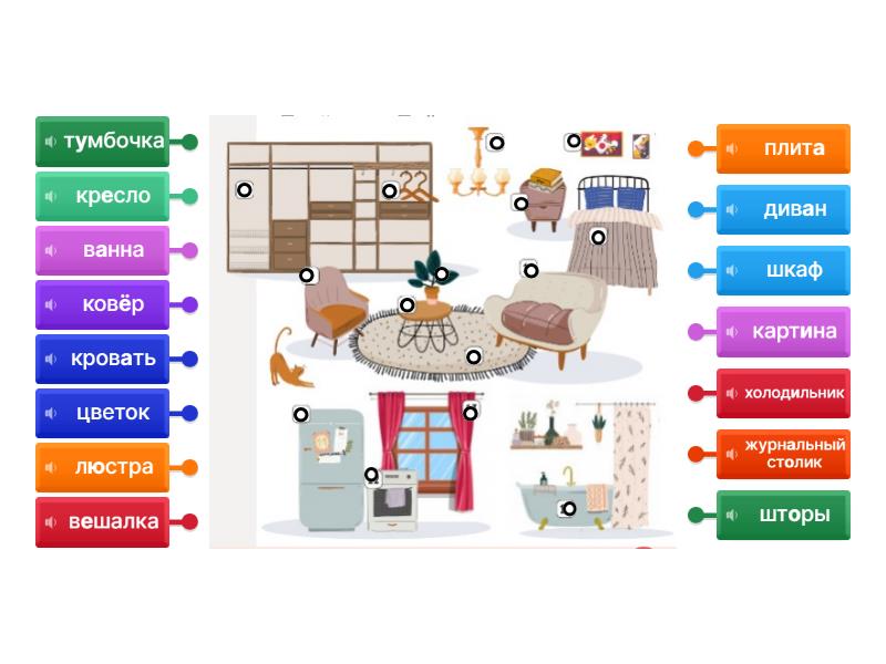 шкаф, вешалка, люстра, тумбочка, картина, кровать, кресло, журнальный столик, ковёр, диван, холодильник, плита, шторы, ванна, цветок.